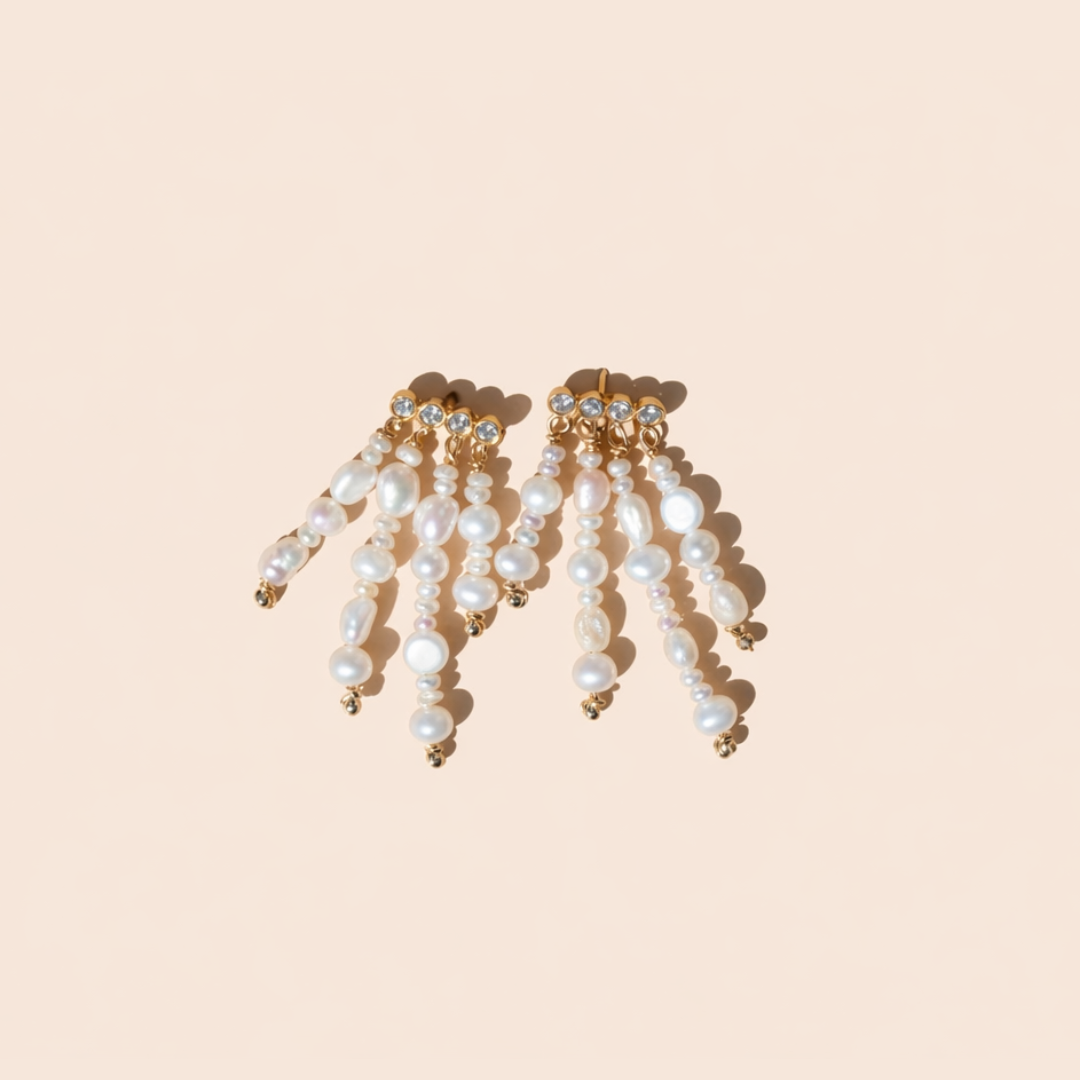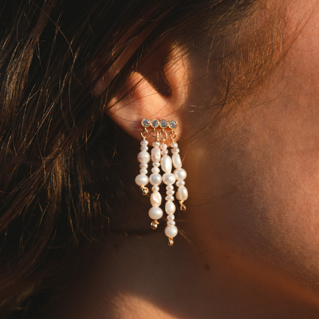 Ces boucles d'oreilles réunissent perles d'eau douce naturelles et zircons sur des apprêts en plaqué or 3 microns. Les perles, de tailles et de formes variées, se suivent comme sur un fil et les zircons viennent clore la pièce avec un éclat subtil. Une boucle délicate, qui se porte à l'oreille comme on pose un bouquet de fleurs sur une table.