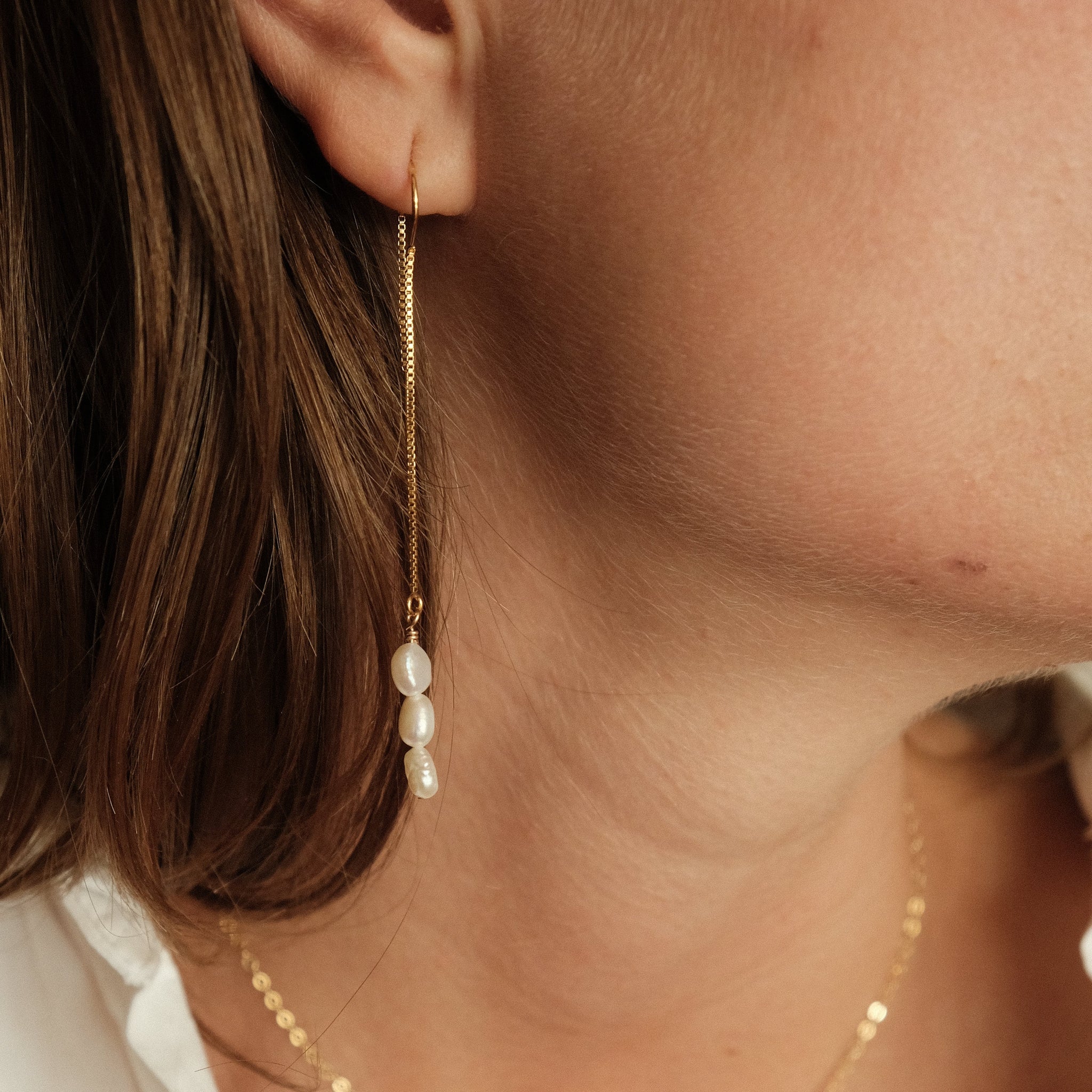Ces boucles d'oreilles sont composées de perles d'eau douce. Elles sont assemblées à la main dans notre atelier à Bordeaux, France. Chaque perle est unique et leur couleur et leur aspérité peuvent légèrement différer de la photo.