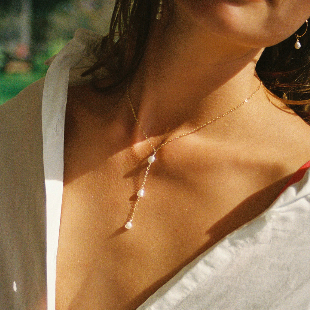 Ce collier est composé d'une chaîne en gold filled 14 carats et met en valeur trois petites perles d'eau douce qui apportent éclat et élégance à la pièce. Il est assemblé à la main dans notre atelier à Bordeaux, France. Chaque perle est unique et leur couleur et leur aspérité peuvent légèrement différer de la photo.