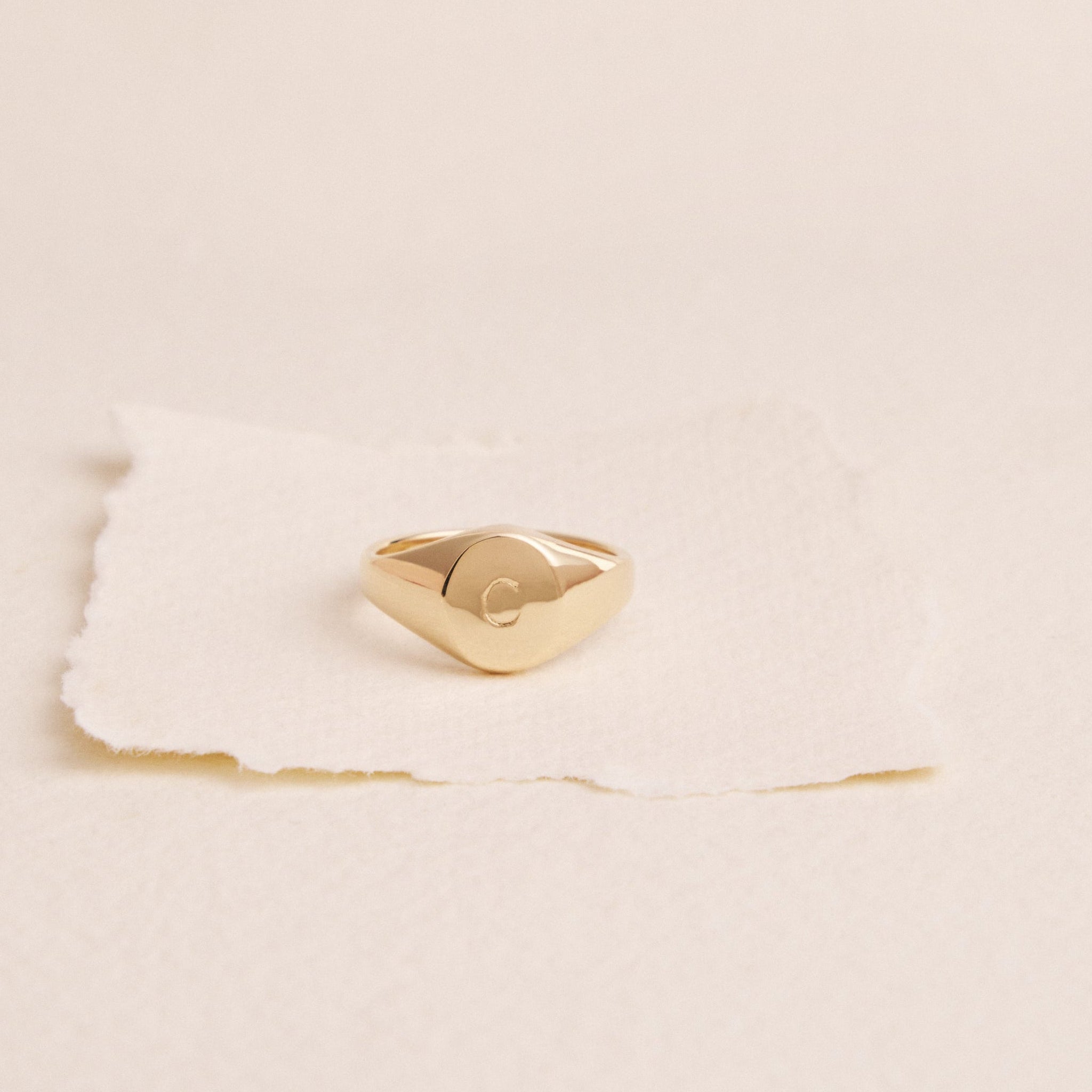 Cette chevalière est en plaqué or 3 microns 18 carats. Elle est estampée à la main dans notre atelier à Bordeaux, France.