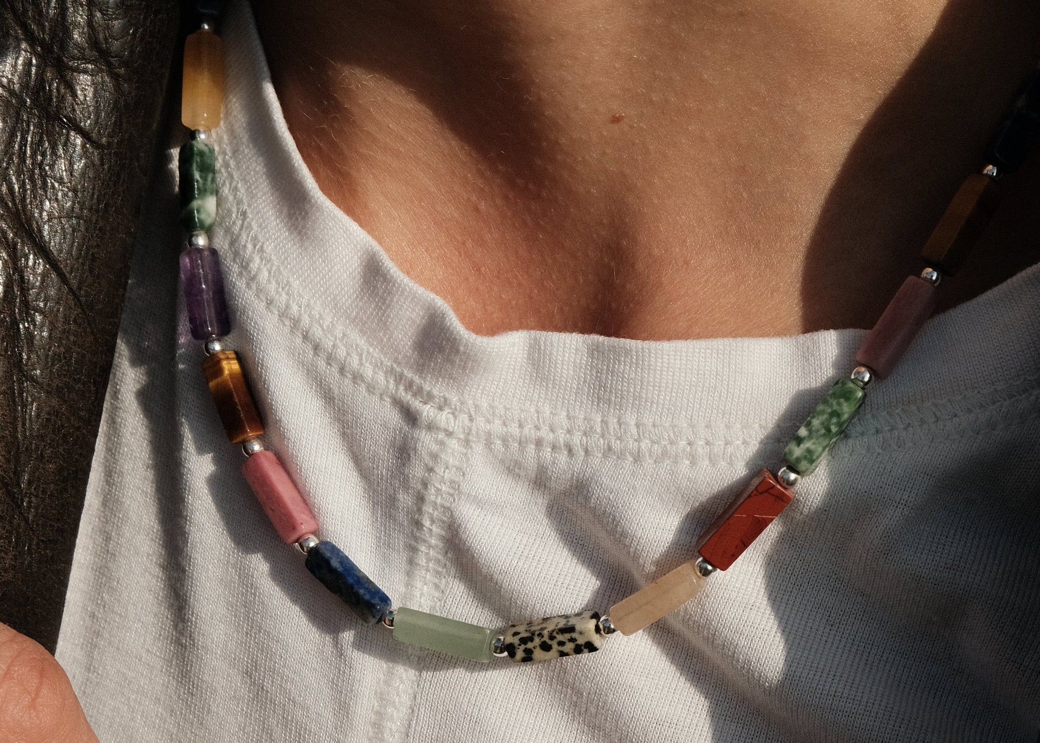 Le collier Lori est composé de pierres naturelles améthyste, aventurine, jaspe dalmatien, rhodonite, oeil du tigre, jaspe rouge, lapis lazuli et jaspe verte liées par de fines perles en argent sterling 925. Ce bijou est assemblé à la main dans notre atelier à Bordeaux, France. Chaque pierre est unique et leur couleur et leur aspérité peuvent légèrement différer de la photo.