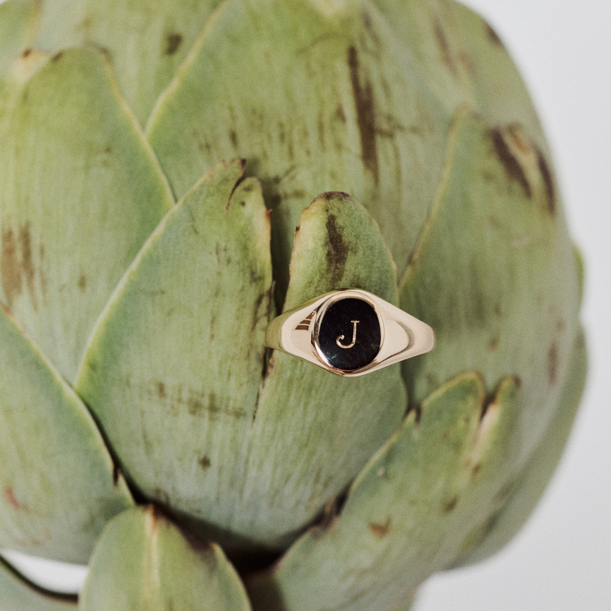 Cette chevalière est en plaqué or 3 microns 18 carats. Elle est estampée à la main dans notre atelier à Bordeaux, France.