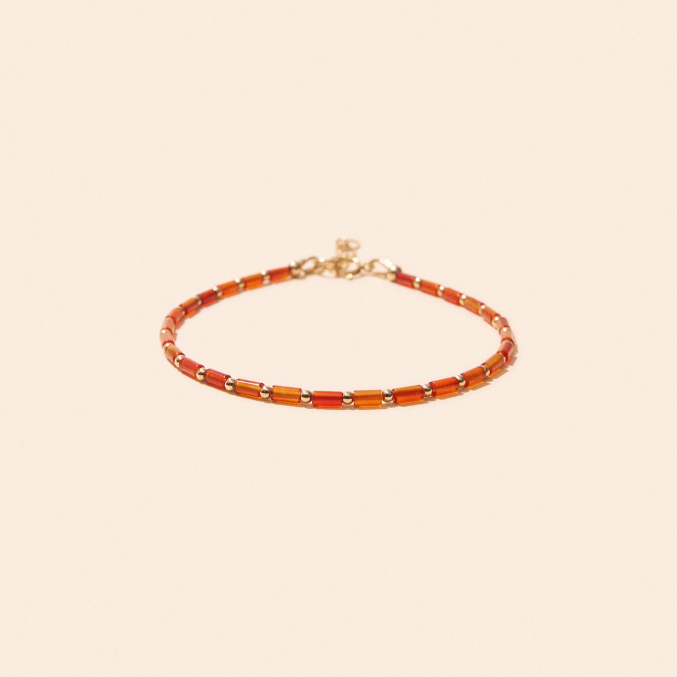 Le bracelet Baia est composé de pierres naturelles forme tubes agate orange liées par de fines perles de gold filled 14 carats. Chaque pierres est unique et leur couleur et leur aspérité peuvent légèrement différer de la photo.