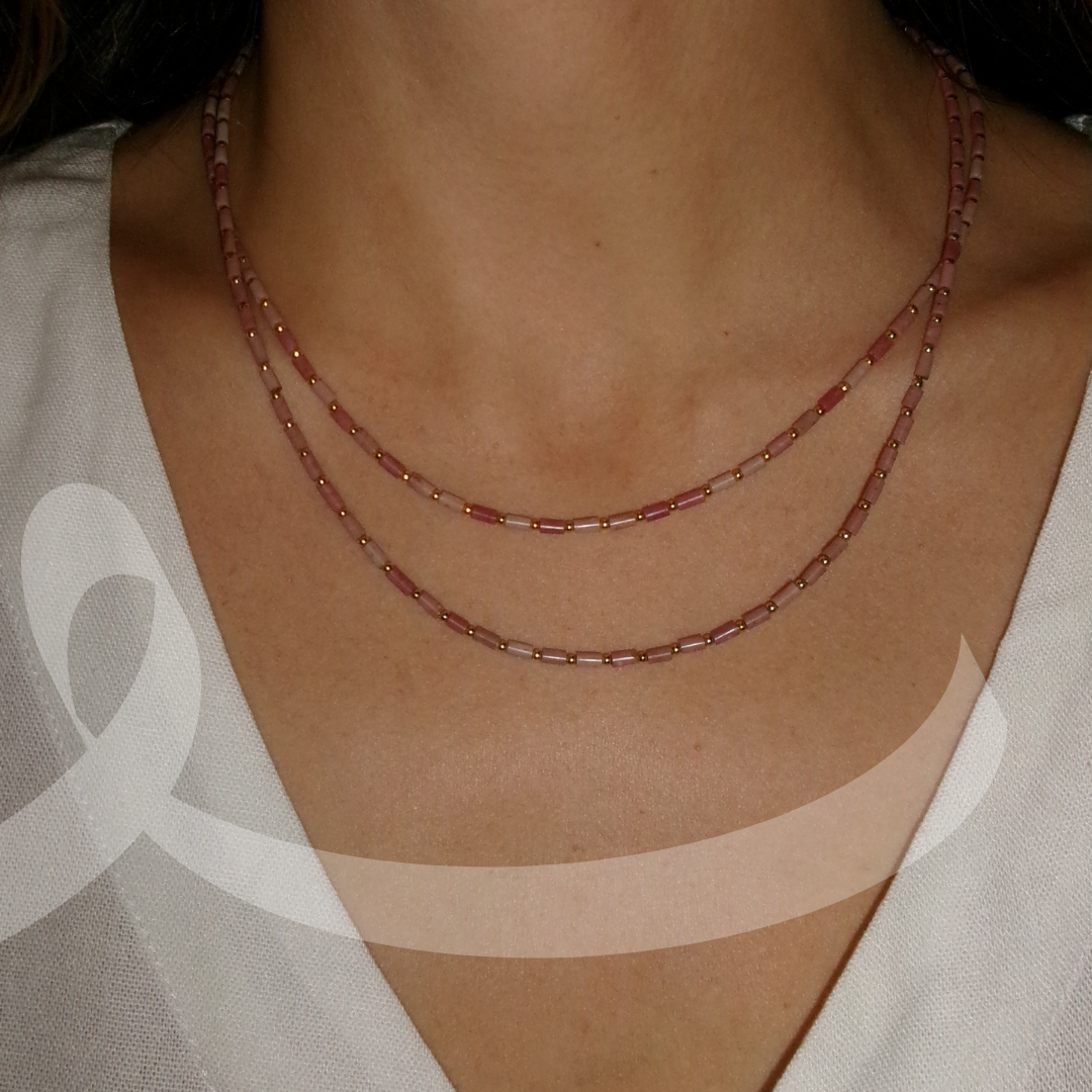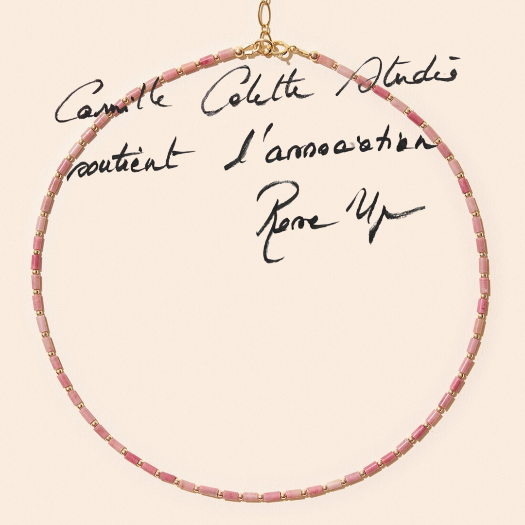 Ce collier soutient une belle cause : les bénéfices seront reversés à l’association RoseUp, qui informe, accompagne et défend les droits des femmes touchées par tout type de cancer partout en France. RoseUp est une association de patientes à la fois combattante et bienveillante, qui redonne aux femmes les clés pour rester actrices de leur parcours de vie et de soins, dès l’annonce de la maladie, pendant et après les traitements.