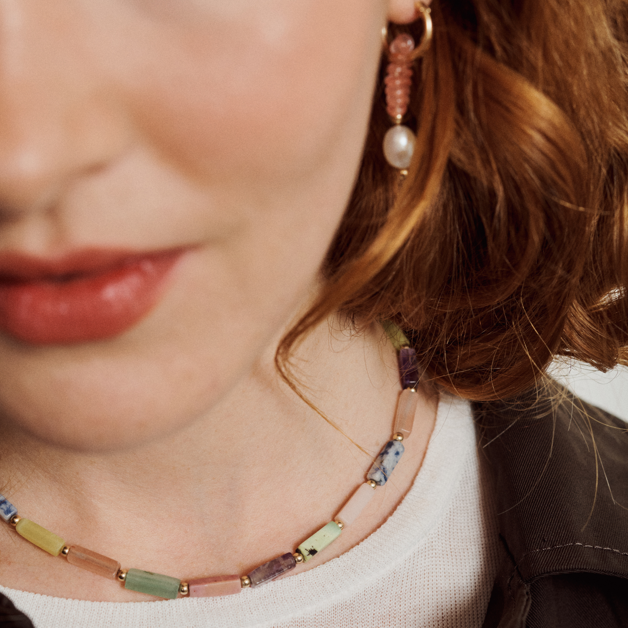 Le collier est composé d’un mélange de pierres naturelles et d’apprêts en gold filled 14 carats.